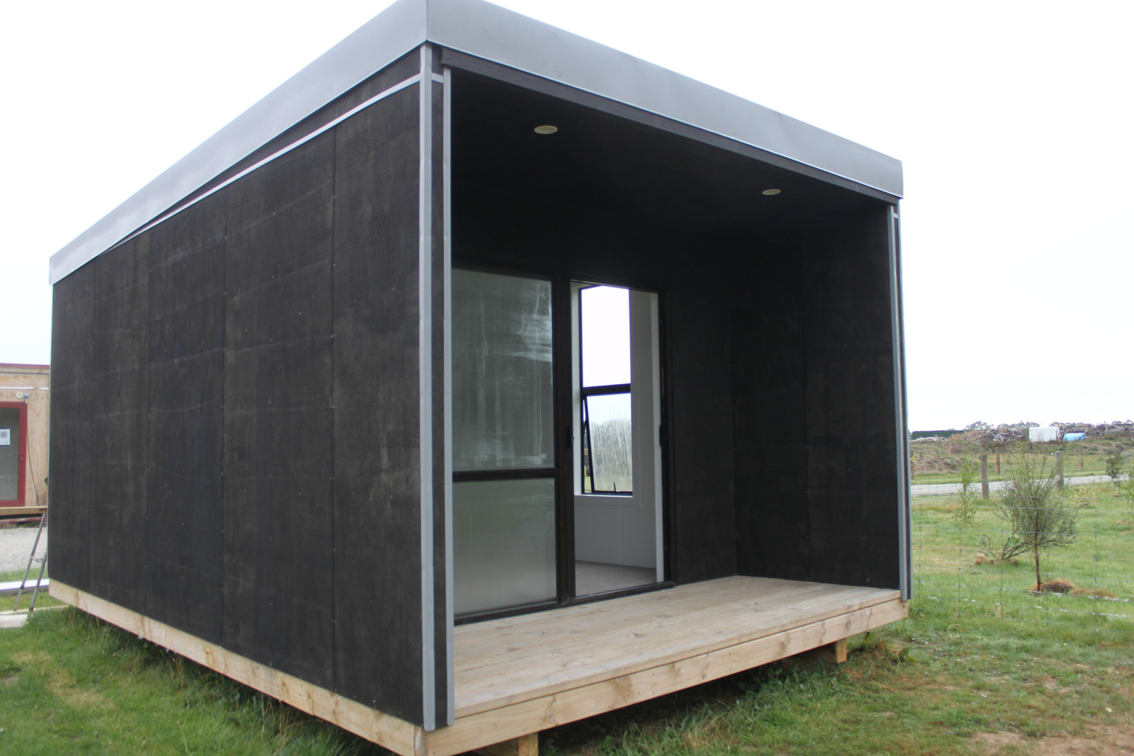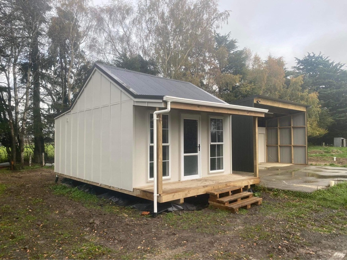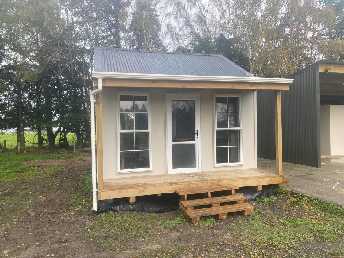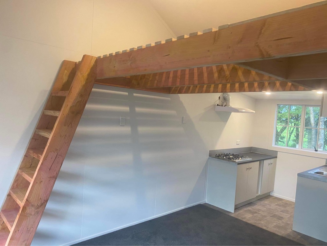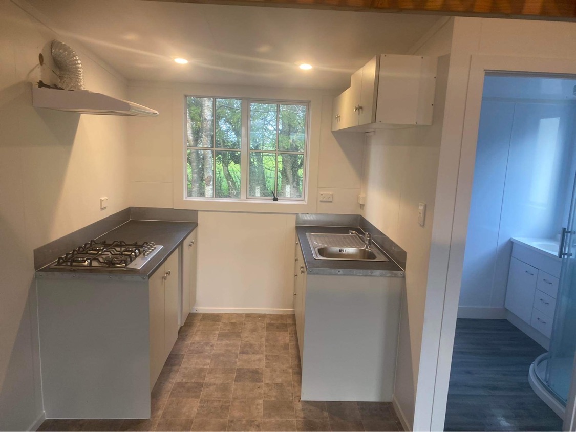 Self-contained cabin with living, kitchen, bathroom and bedroom area.